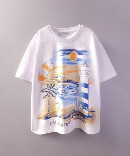 تیشرت سفید چاپدار (دخترانه و پسرانه) طرح فانوس دریایی -فونت برجسته- نخ و پنبه