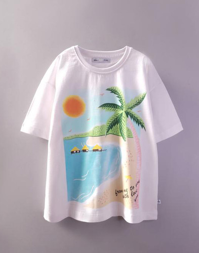 ناموجودتیشرت سفید چاپدار (دخترانه و پسرانه) طرح خورشید نارنجی و ساحل هاوایی -فونت برجسته- نخ و پنبه