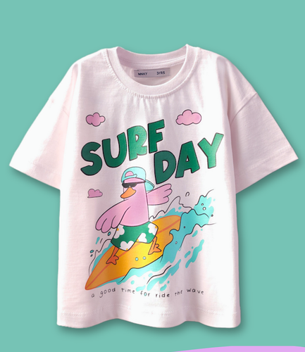 تیشرت سفید چاپدار (دخترانه و پسرانه) طرح جوجه صورتی موج سوار -فونت برجسته- نخ و پنبه