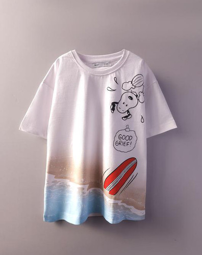 تیشرت سفید چاپدار (دخترانه و پسرانه) طرح اسنوپی و تخته شنا -فونت برجسته- نخ و پنبه