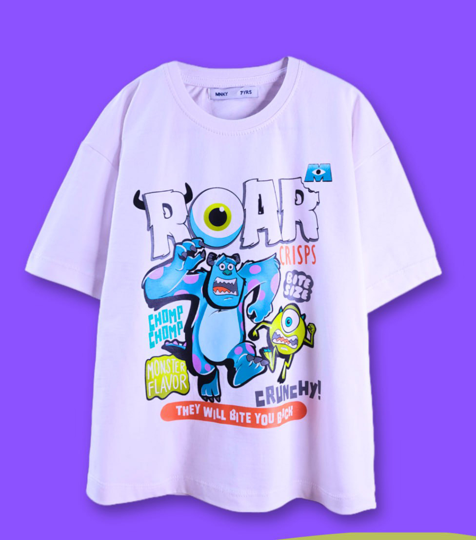 ناموجودتیشرت سفید چاپدار (دخترانه و پسرانه) طرح کارخانه هیولاها -فونت برجسته- نخ و پنبه