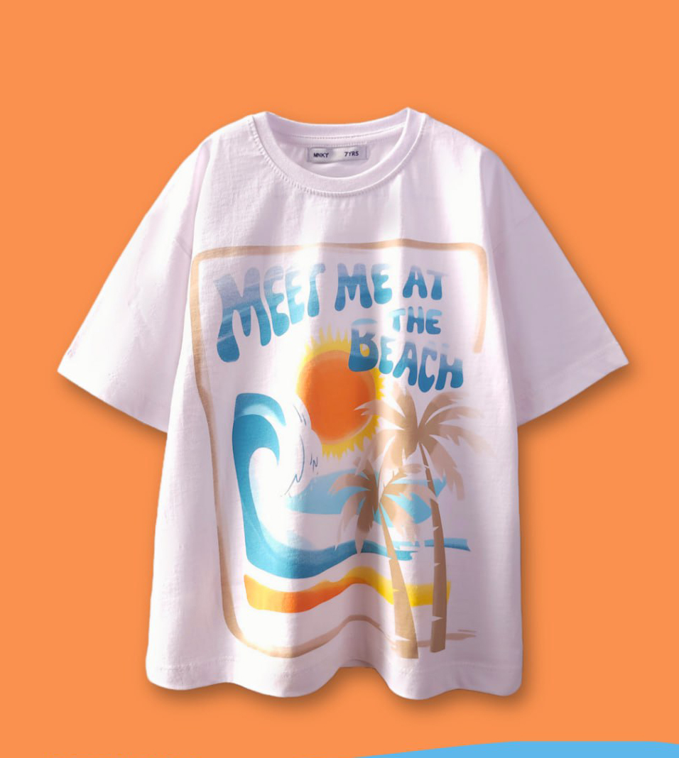 ناموجودتیشرت سفید چاپدار (دخترانه و پسرانه) طرح خورشید نارنجی و ساحل هاوایی -فونت برجسته- نخ و پنبه