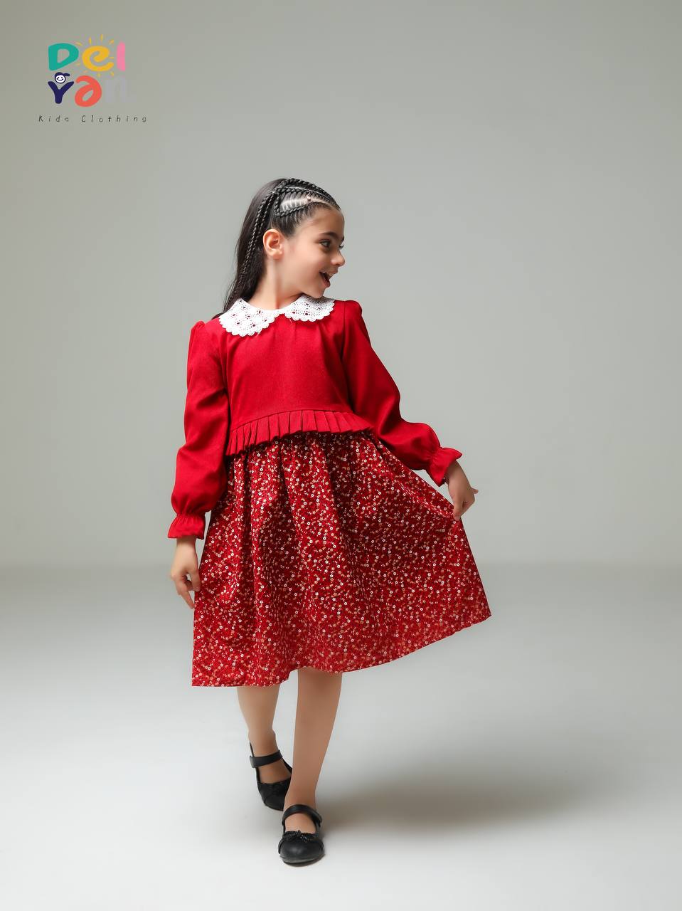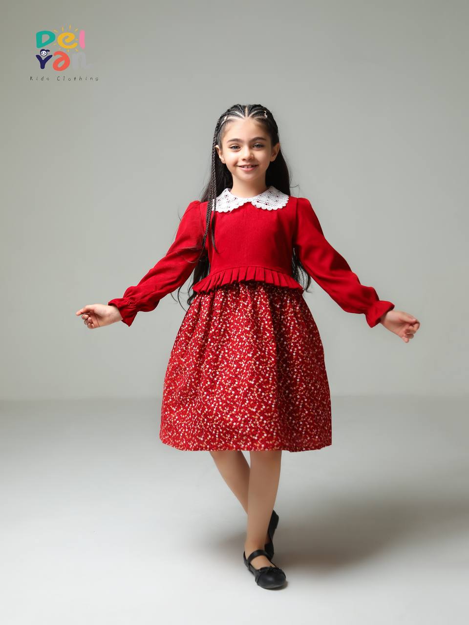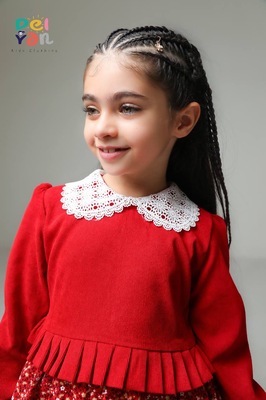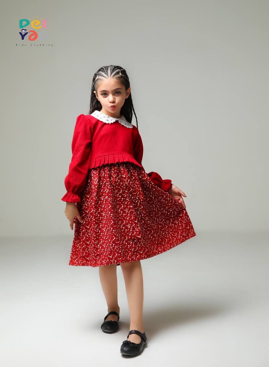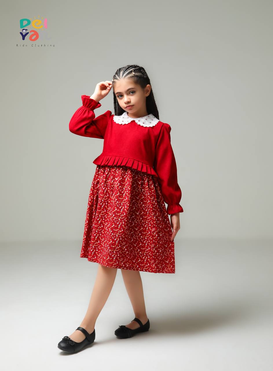 پیراهن دخترانه مخمل کبریتی ریز و دامن کتان گلدار و یقه دانتل
